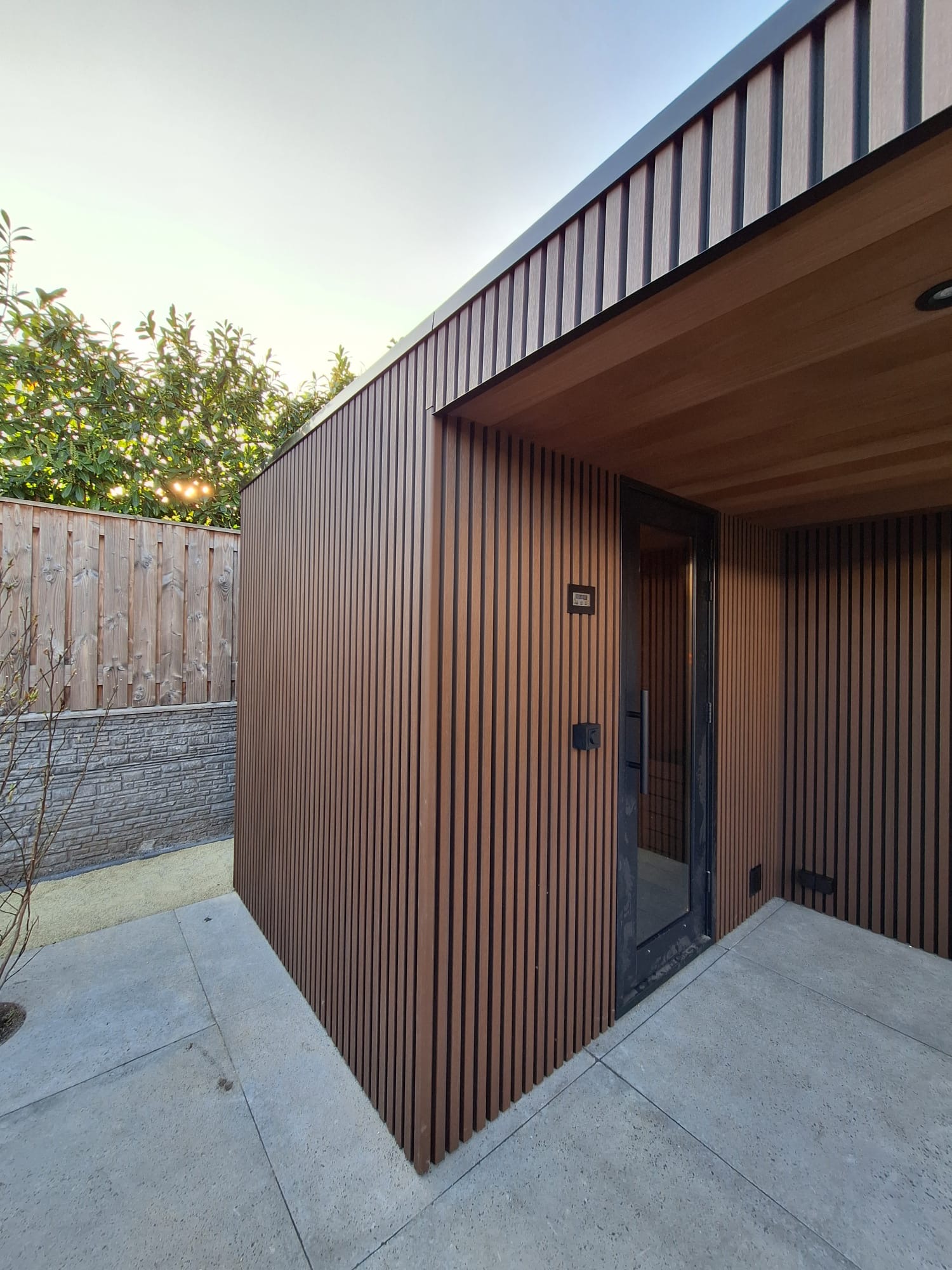 Verleihen Sie Ihrem Haus, Ihrer Scheune oder Ihrem Anbau eine moderne und hochwertige Ausstrahlung mit unserer WPC-Fassadenverkleidung im Rhombus-Profil. Die Dielen sind mit einer Co-Extrusions-Schutzschicht versehen. Dadurch nehmen sie keine Feuchtigkeit auf, bleiben farbecht und sind extrem langlebig. Diese Teak-Dielen mit schwarzem Hintergrund sorgen für eine zusätzliche optische Tiefenwirkung.