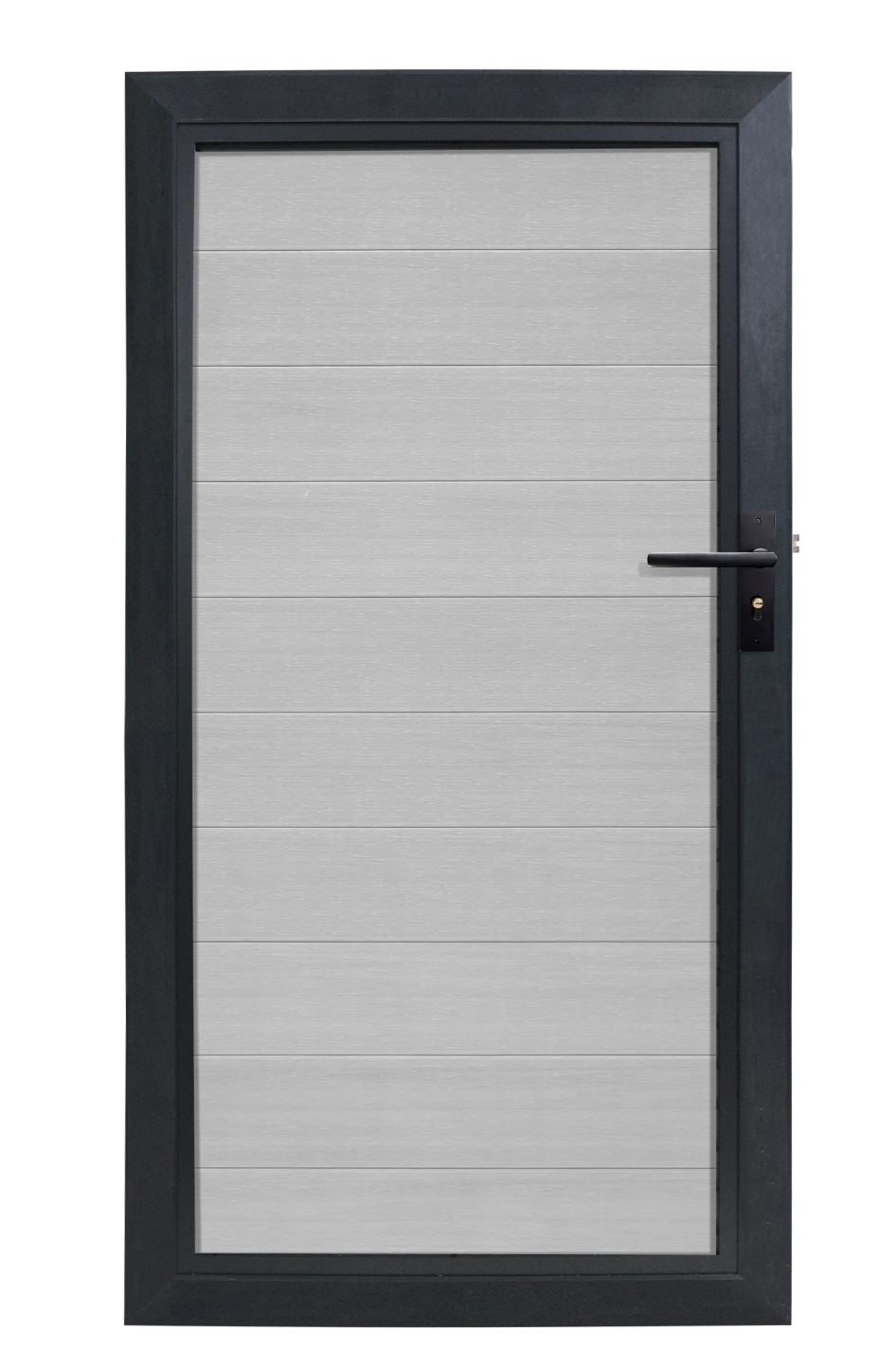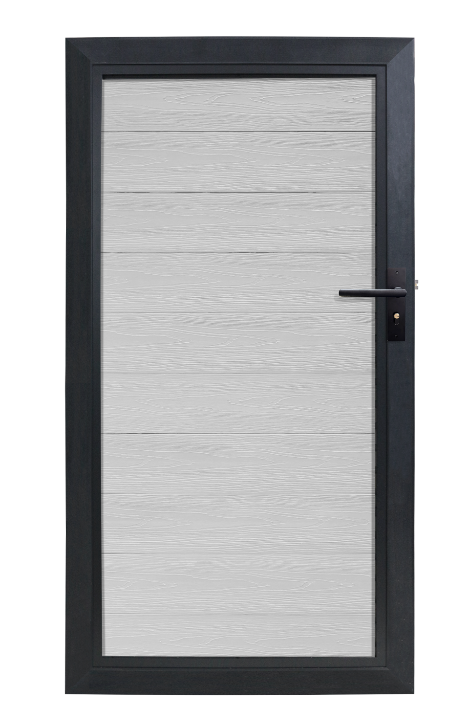 Eine graue Komposit-Gartentür wird komplett geliefert, das einzige, was du benötigst, ist unser Aluminium-Kompositzaunpfosten. Die Gartentor-Scharniere können an unseren Aluminiumpfosten geschraubt werden, dasselbe gilt für die Schlagleiste. (beide können auch an einer Wand befestigt werden)